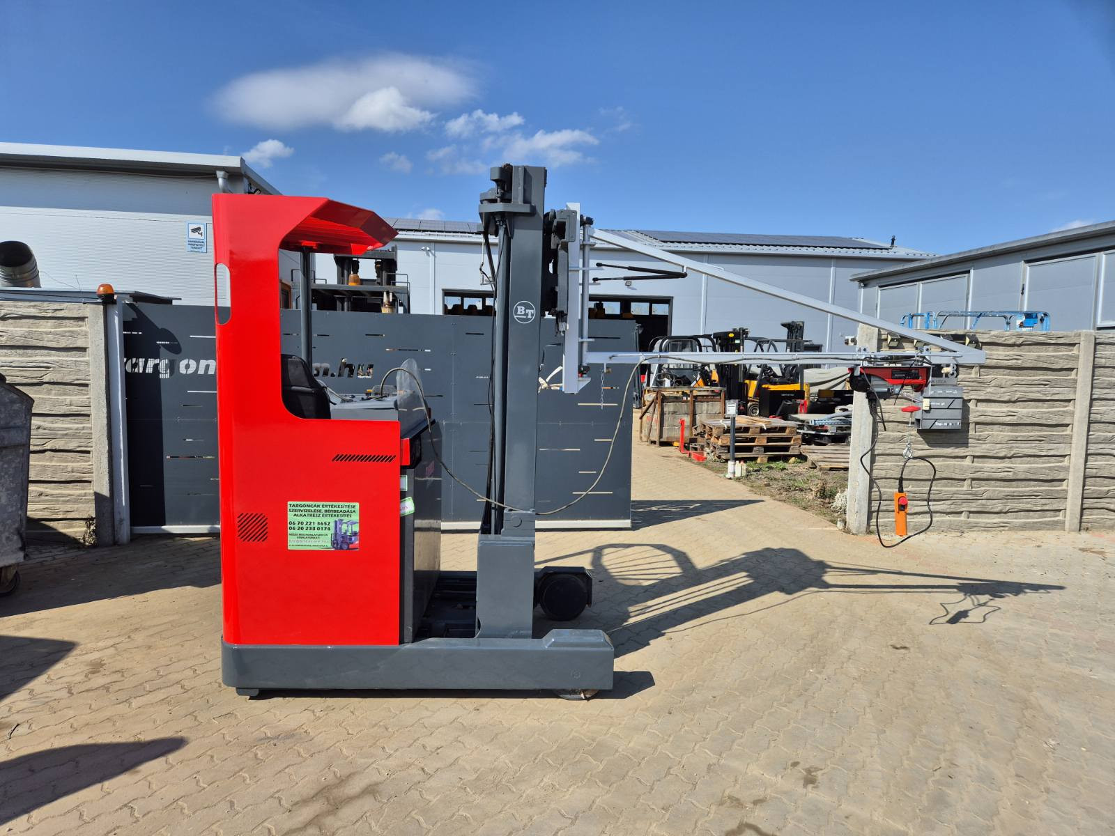 Eladó BT RR M14 típusú elektromos tolóoszlopos targonca, 1,4 t teherbírással, motor, váltó kiemelő daruval, daru teherbírása 250 kg, 5,4 m emelési magasság, 1,7 m szabademeléssel, 48V/650Ah Hawker akkumulátorral, töltővel, 4663 üzemórával, kitűnő állapotban. (299)