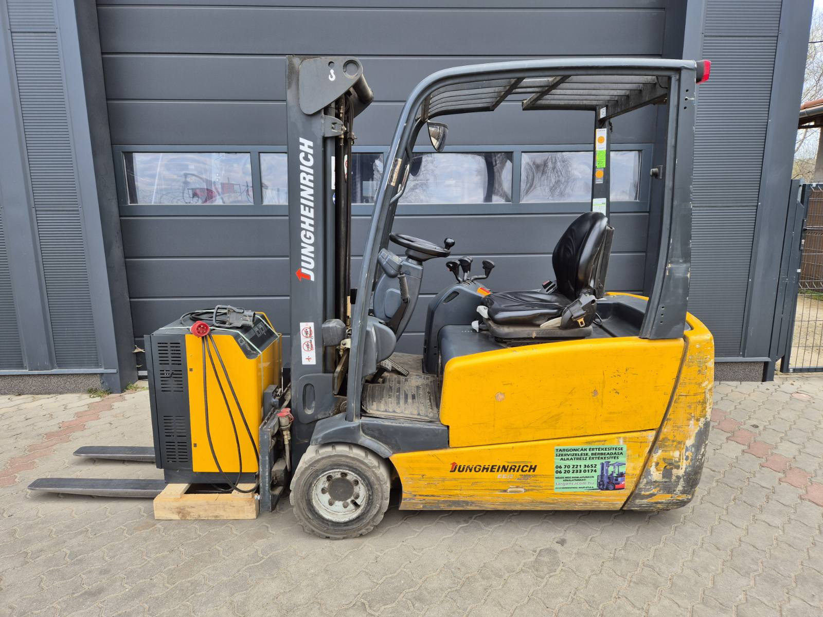 Eladó Jungheinrich EFG 220 típusú elektromos homlokvillás targonca, 1,9 t teherbírás, 4,6 m emelési magasság, 1,5 m szabademeléssel, 48V/750Ah Hawker akkumulátorral, töltővel, oldalmozgatóval, munkalámpával, kitűnő állapotban. (303)