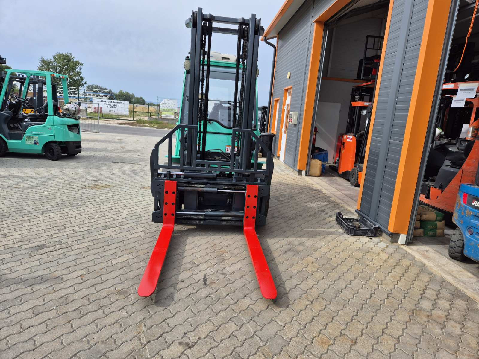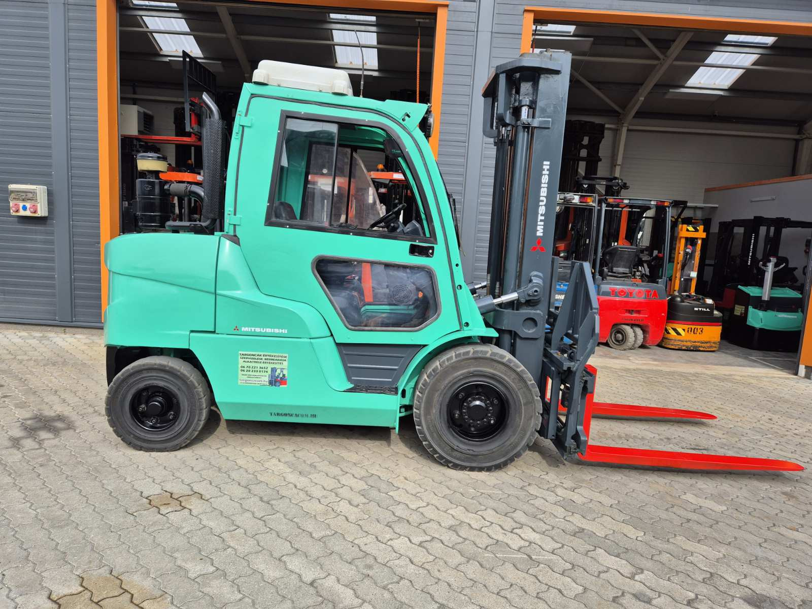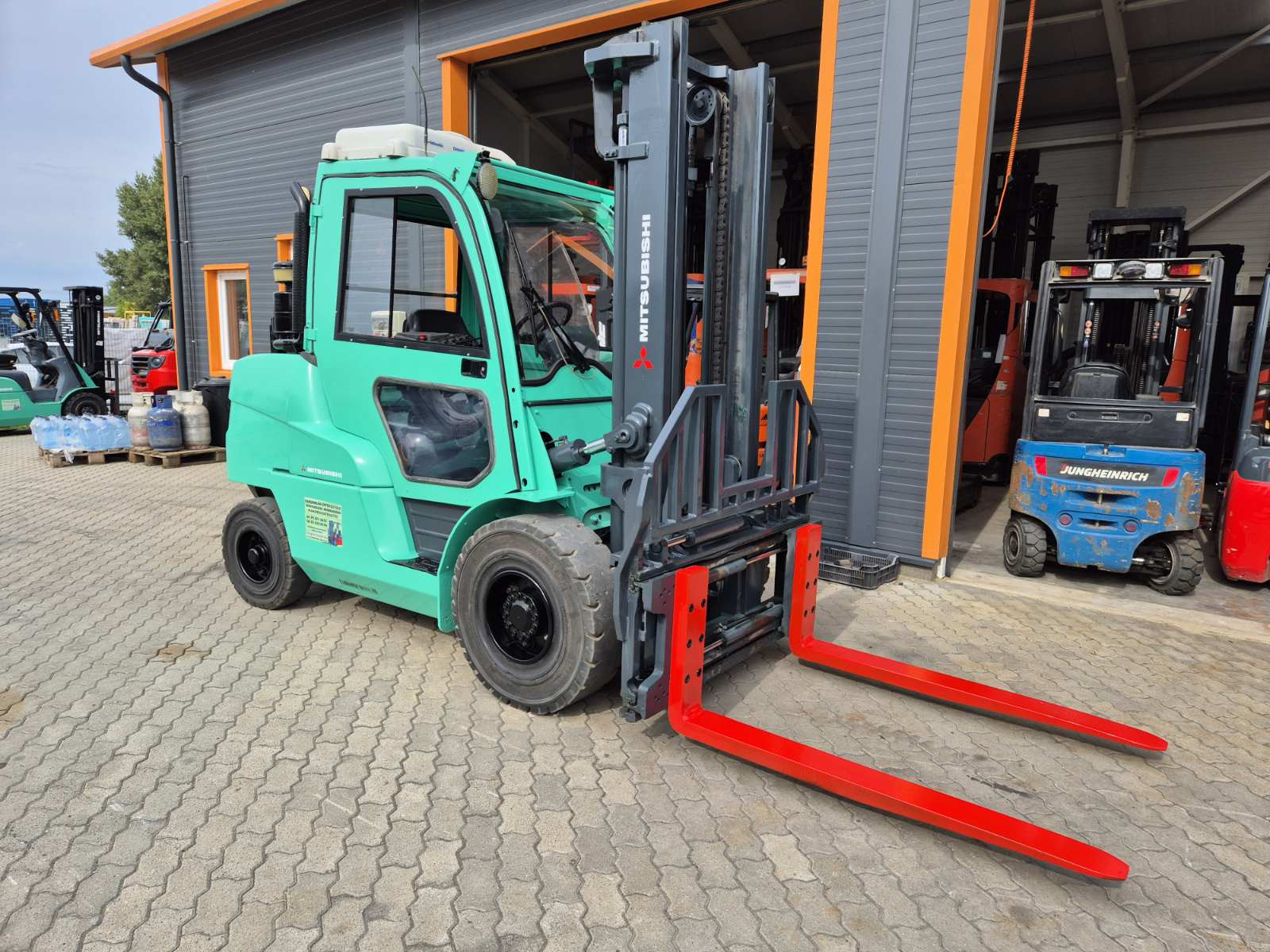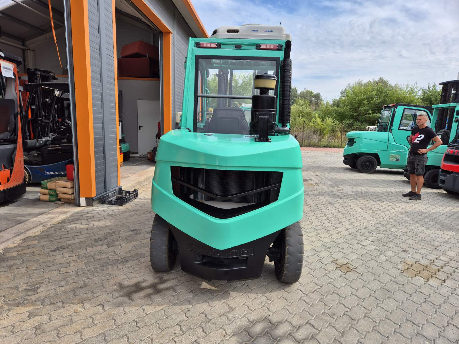 Eladó Mitsubishi FD 50NT típusú diesel targonca, 5 t teherbírás, 3,7 m emelési magasság, Mitsubishi motorral, 6080 uzemórával, oldalmozgatóval, villapoziciónálóval, fülkefűtéssel, klímával, ablaktörlővel, munkalámpával, kitűnő állapotban. (T05)