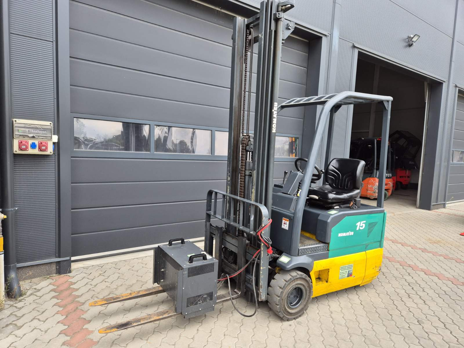 Eladó Komatsu FB15MG-2R típusú elektromos homlokvillás targonca, 1,5 t teherbírás, 6,4 m emelési magasság, 2,2 m szabademeléssel, 48V/650Ah Hawker akkumulátorral. töltővel, 2674 üzemórával, oldalmozgatóval, kitűnő állapotban. (17)
