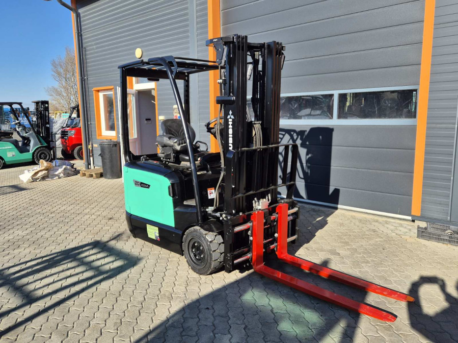 Eladó Mitsubishi FB 14ANT típusú elektromos targonca, 1,4 t teherbírás, 4,75 m emelési magasság, 1,6 m szabademeléssel, 48V/500Ah Hawker akkumulátorral, töltővel, 6425 üzemórával, oldalmozgatóval, munkalámpával, kitűnő állapotban. (448)