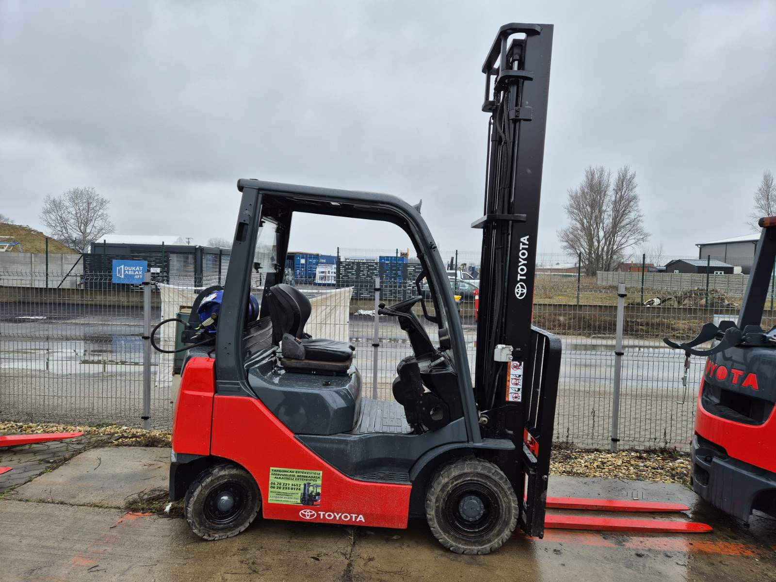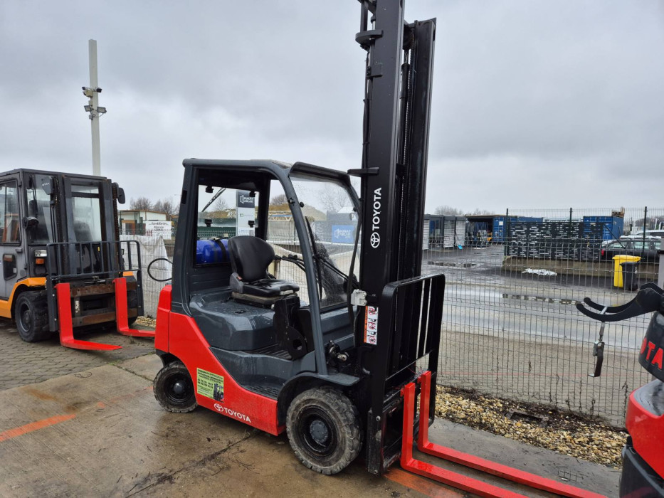 Eladó Toyota 8FG-15 típusú gázüzemű targonca, 1,5 t teherbírás, 5,05 m emelési magasság, Toyota motorrasl, oldalmozgatóval, 2860 üzemórával, szélvédővel, fűtéssel, kitűnő állapotban. (99)