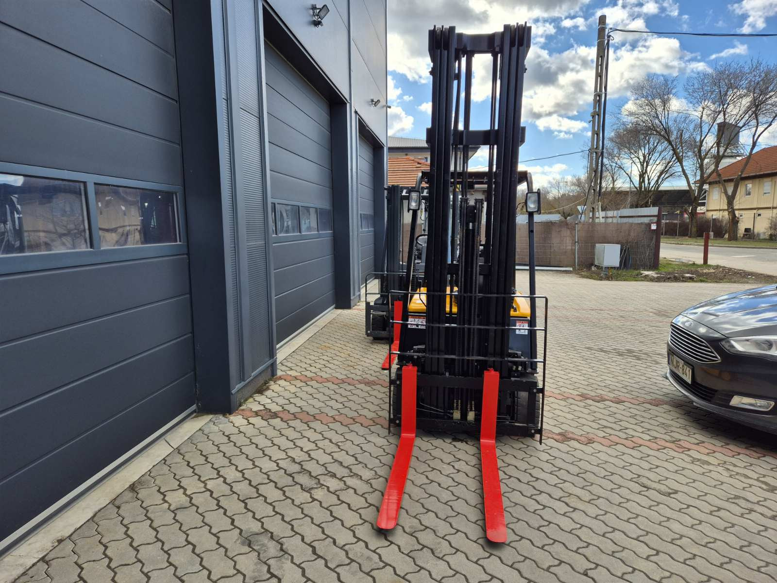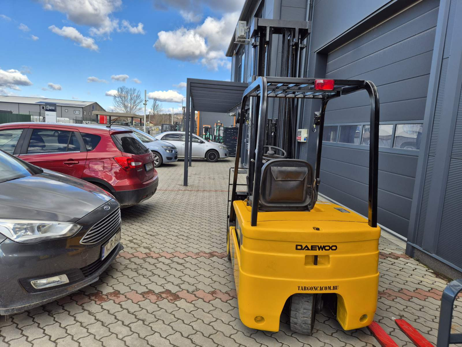 Eladó Daewoo B18-T típusú elektromos homlokvillás targonca, 1,8 t teherbírás, 6,2 m emelési magasság, 2,3 m szabademeléssel, 48V/750Ah Hawker akkumulátorral, töltővel, 3113 üzemórával, oldalmozgatóval, munkalámpával, kitűnő állapotban. (T09)