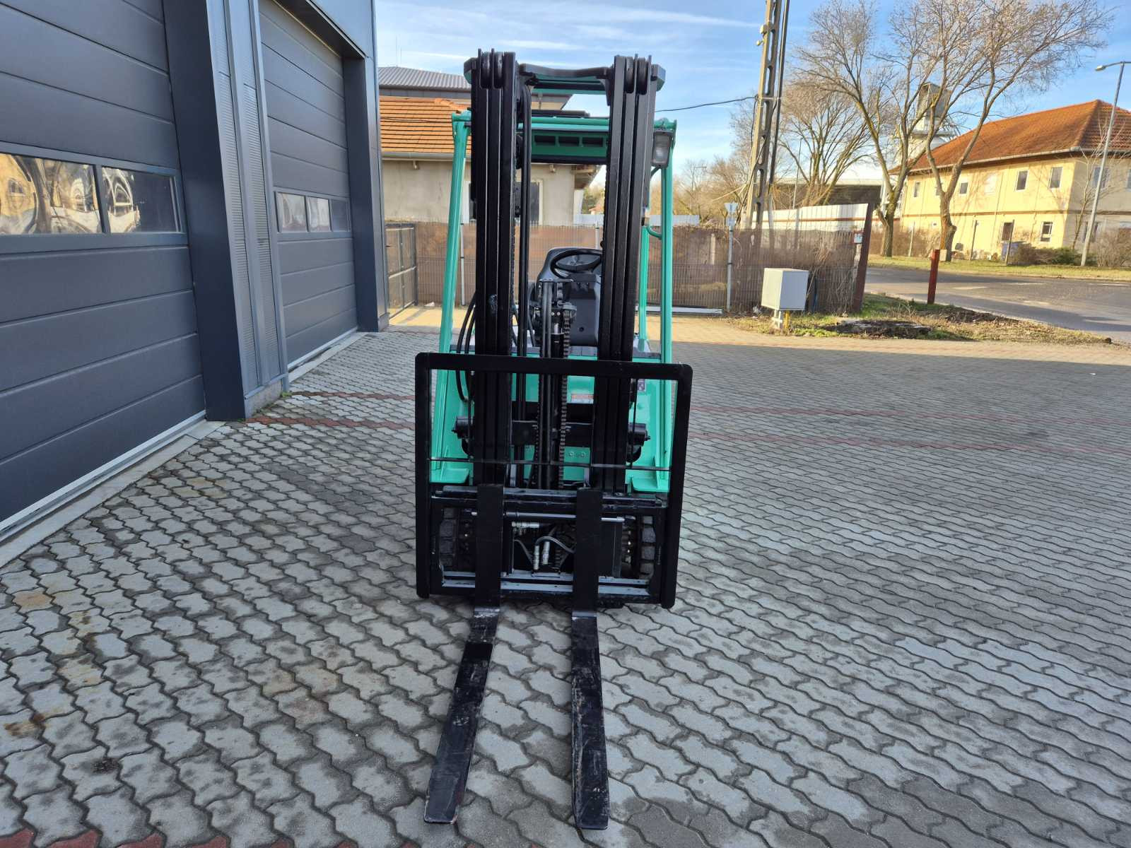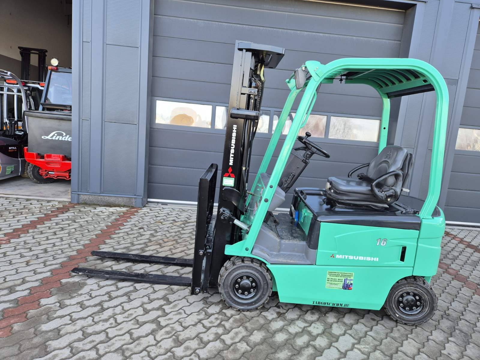 Eladó Mitsubishi EFB 16N típusú elektromos homlokvillás targonca, 1,6 t teherbírás, 4,75 m emelési magasság, 1,7 m szabademeléssel, 48V/650Ah Hawker akkumulátorral, töltővel, 6157 üzemórával, oldalmozgatóval, munkalámpával, kitűnő állapotban. (T14)