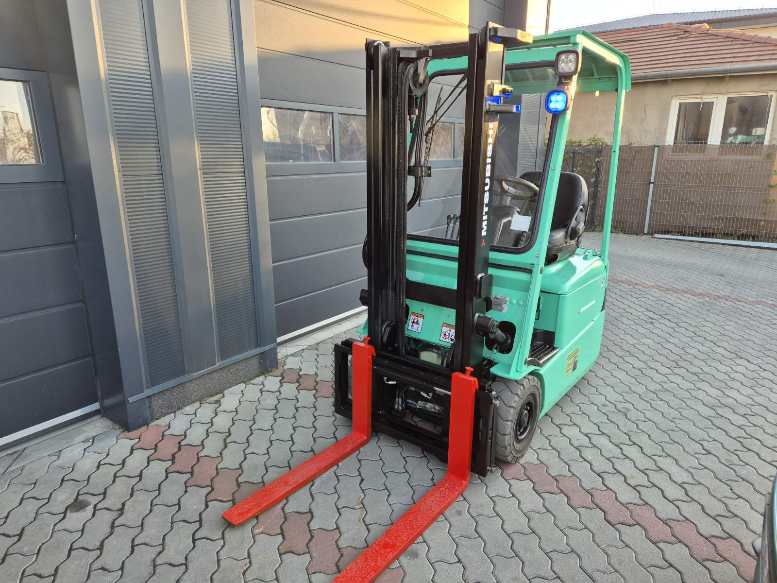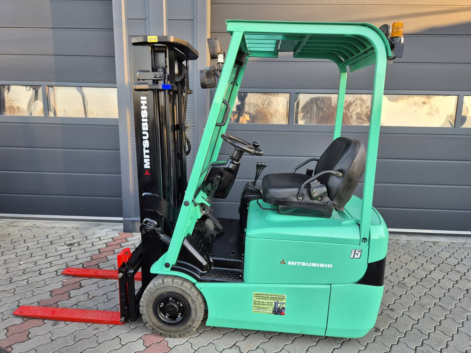 Eladó Mitsubishi FB15KRT-PAC típusú elektromos homlokvillás targonca, 1,5 t teherbírás, 3 m emelési magasság, 24V/850Ah Hawker akkumulátorral, töltővel, 1735 üzemórával, oldalmozgatóval, munkalámpával, kitűnő állapotban. (T77)
