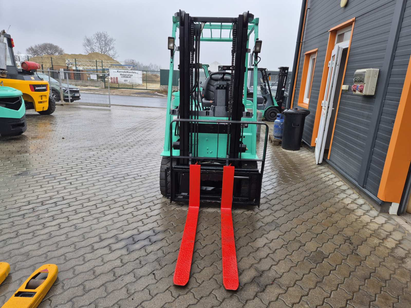 Eladó Mitsubishi FB 25K-PAC típusú elektromos homlokvillás targonca, 2,5 t teherbírás, 3,3 m emelési magasság, 80V/600Ah Hawker akkumulátorral, töltővel, 3346 üzemórával, oldalmozgatóval, munkalámpával, kitűnő állapotban. (T98)