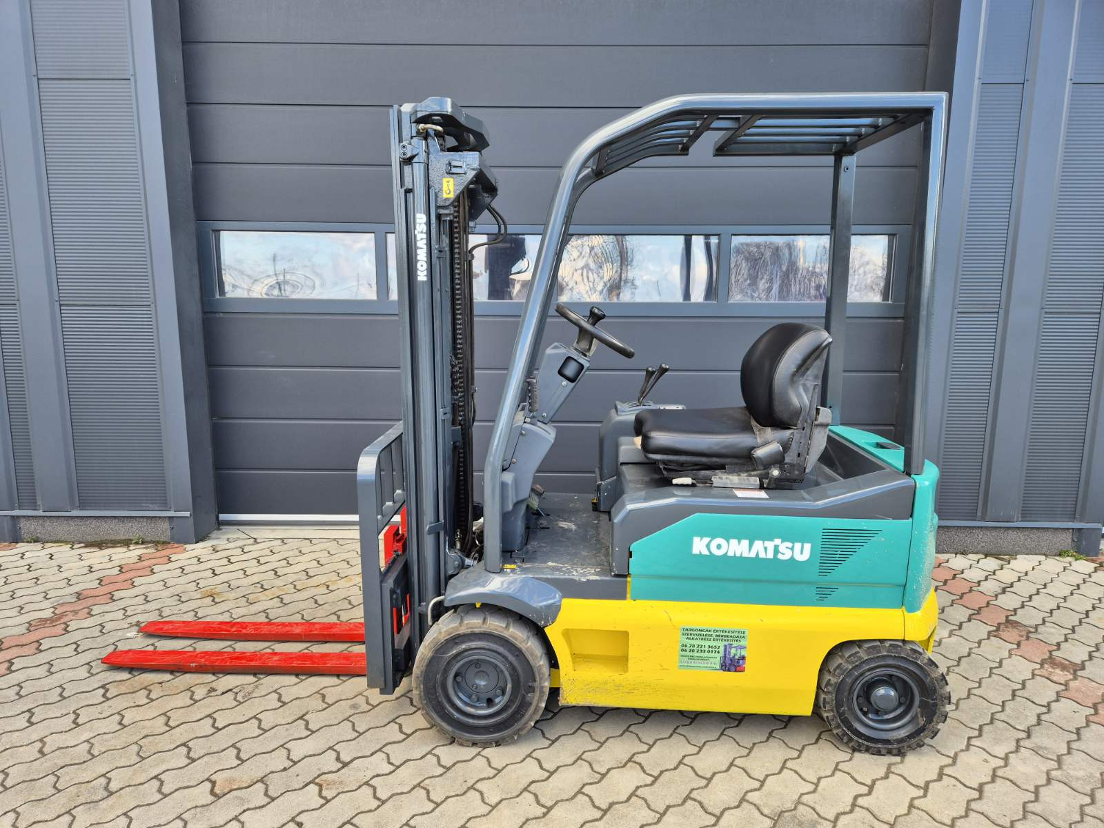 Eladó Komatsu FB15M-2R típusú elektromos homlokvillás targonca, 1,5 t teherbírás, 4,5 m emelési magasság, 1,55 m szabademeléssel, 48V/625Ah Hawker akkumulátorral, töltővel, oldalmozgatóval, kitűnő állapotban. (165)