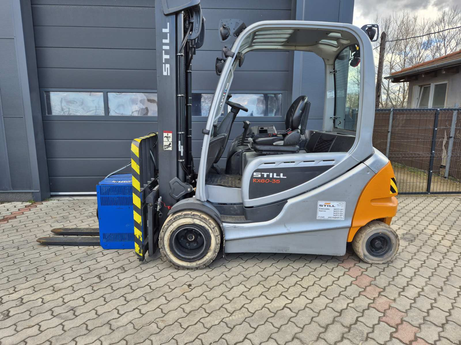 Eladó Still RX 60-35 típusú elektromos homlokvillás targonca, 3,5 t teherbírás, 5,4 m emelési magasság, 1,85 m szabademeléssel, 80V/775Ah Hawker akkumulátorral, töltővel, oldalmozgatóval, nyommentes abroncsokkal, munkalámpával, kitűnő állapotban. (177)
