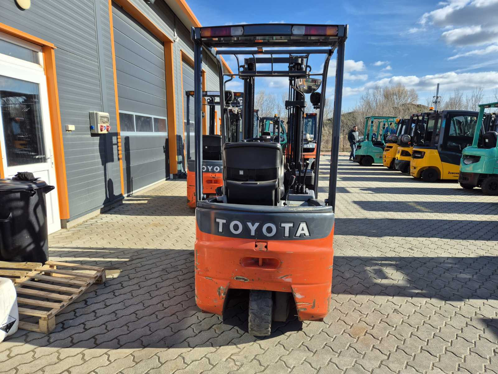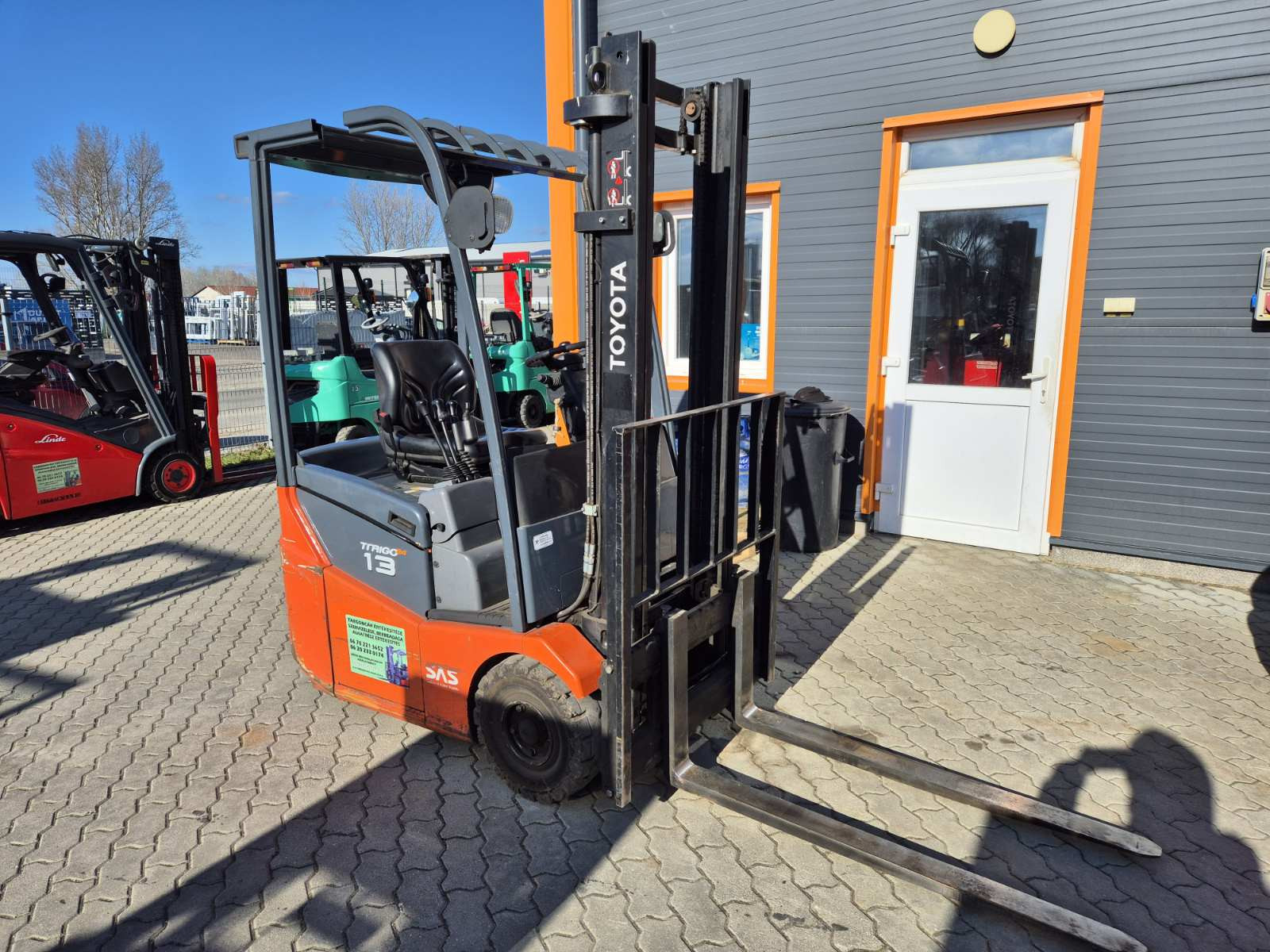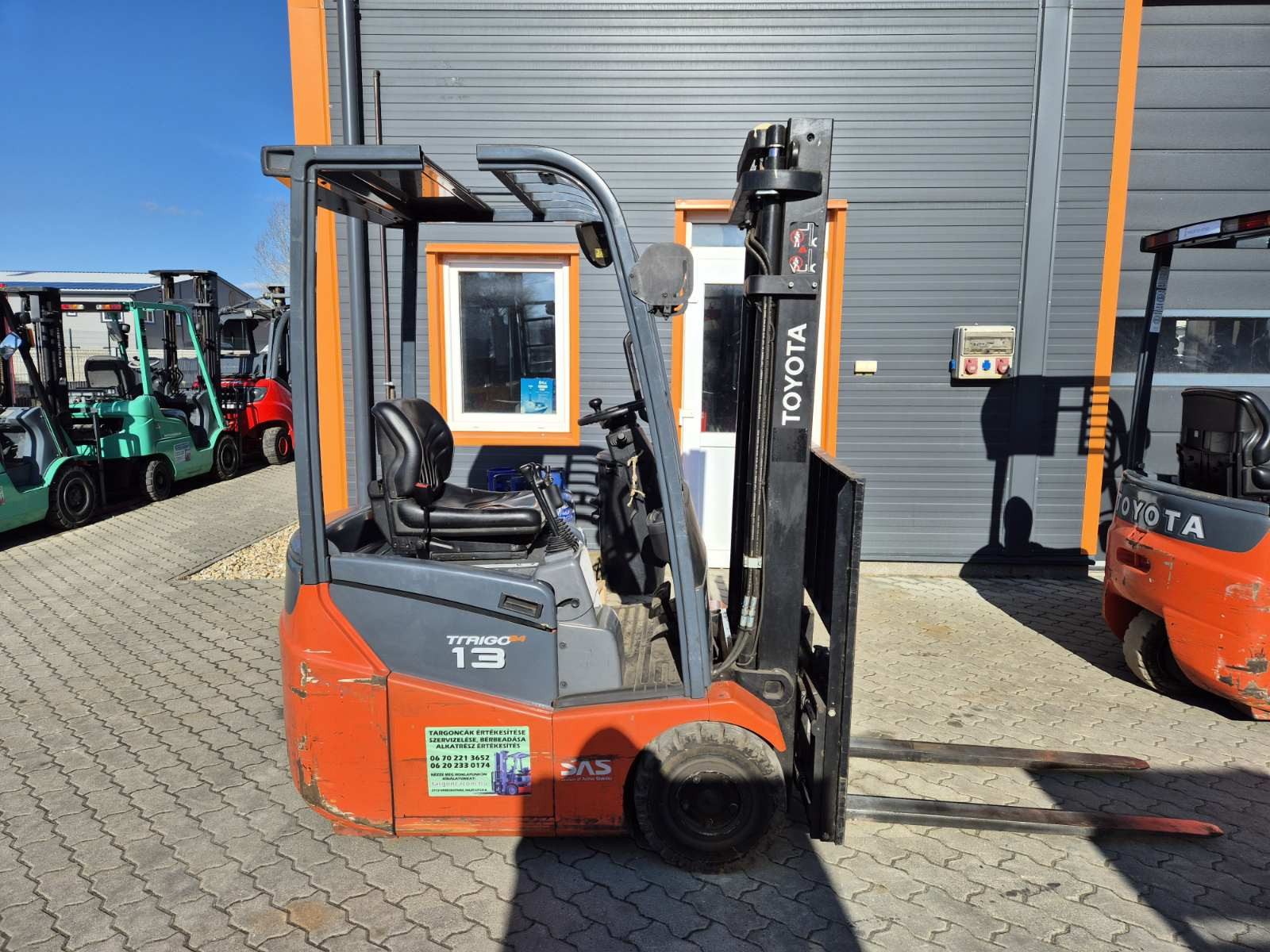 Eladó Toyota 7FBEST 13 típusú elektromos homlokvillás targonca, 1,3 t teherbírás, 3,3 m emelési magasság, 24V/735Ah Hawker akkumulátorral, töltővel, 8296 üzemórával, oldalmozgatóval, munkalámpával, kitűnő állapotban. (202)