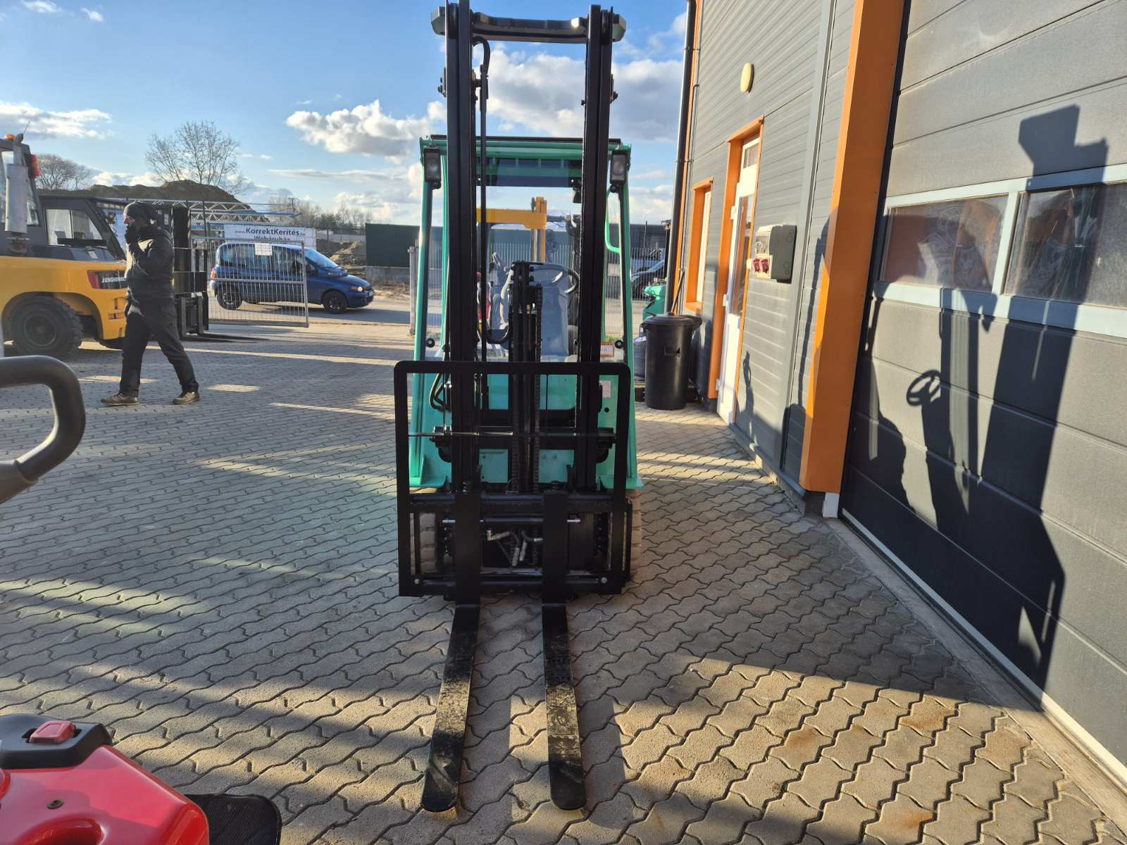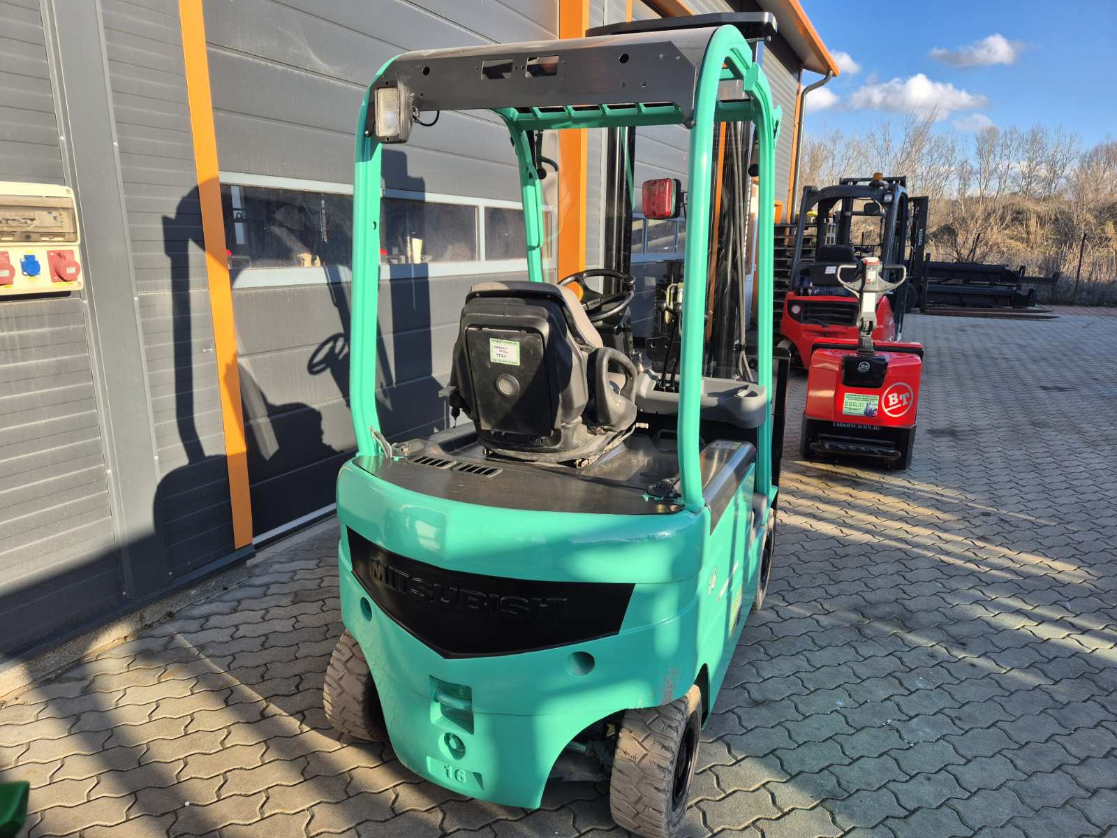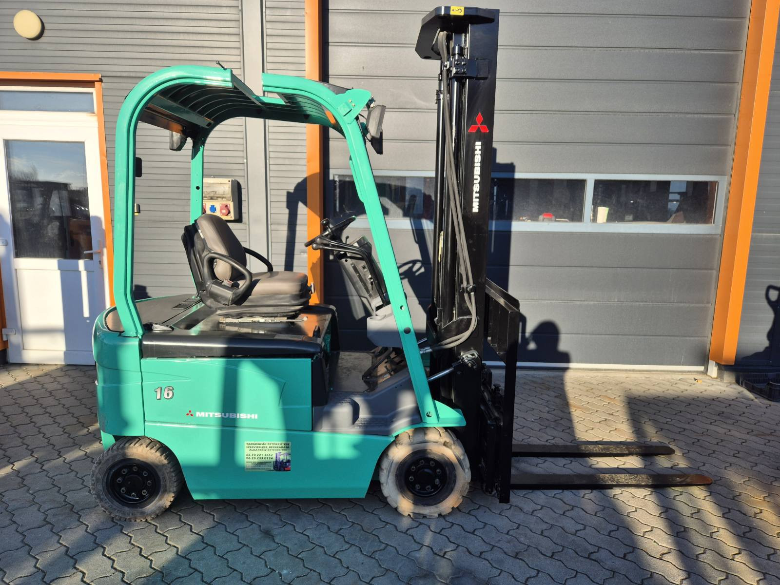 Eladó Mitsubishi FB 16N típusú elektromos homlokvillás targonca, 1,6 t teherbírás, 3,5 m emelési magasság, 1,7 m szabademeléssel, 48V/600Ah Hawker akkumulátorral, töltővel, 9285 üzemórával, nyommentes abroncsokkal, oldalmozgatóval, munkalámpával, kitűnő állapotban. (T61)