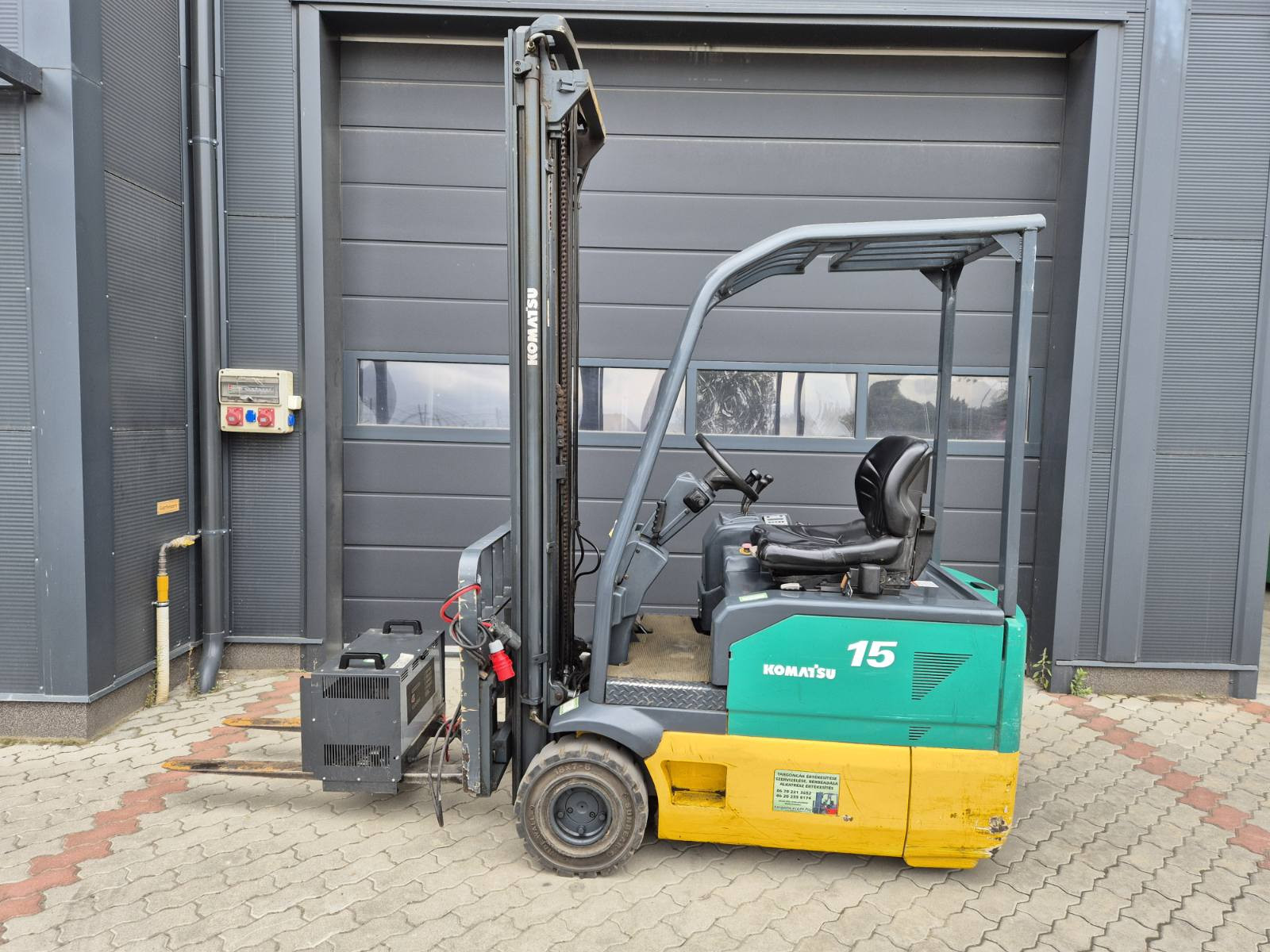 Eladó Komatsu FB15MG-2R típusú elektromos homlokvillás targonca, 1,5 t teherbírás, 6,4 m emelési magasság, 2,2 m szabademeléssel, 48V/650Ah Hawker akkumulátorral. töltővel, 2674 üzemórával, oldalmozgatóval, kitűnő állapotban. (17)