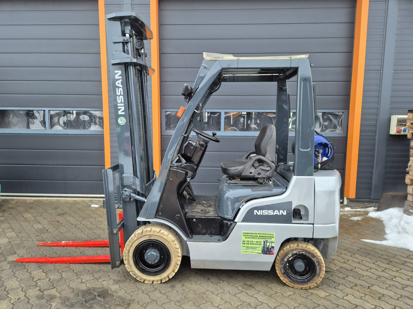 Eladó Nissan P1F1A 15D típusú gázüzemű targonca, 1,5 t teherbírás, 4,05 m emelési magasság, Nissan motorral, nyomot nem hagyó abroncsokkal, kitűnő állapotban. (197)