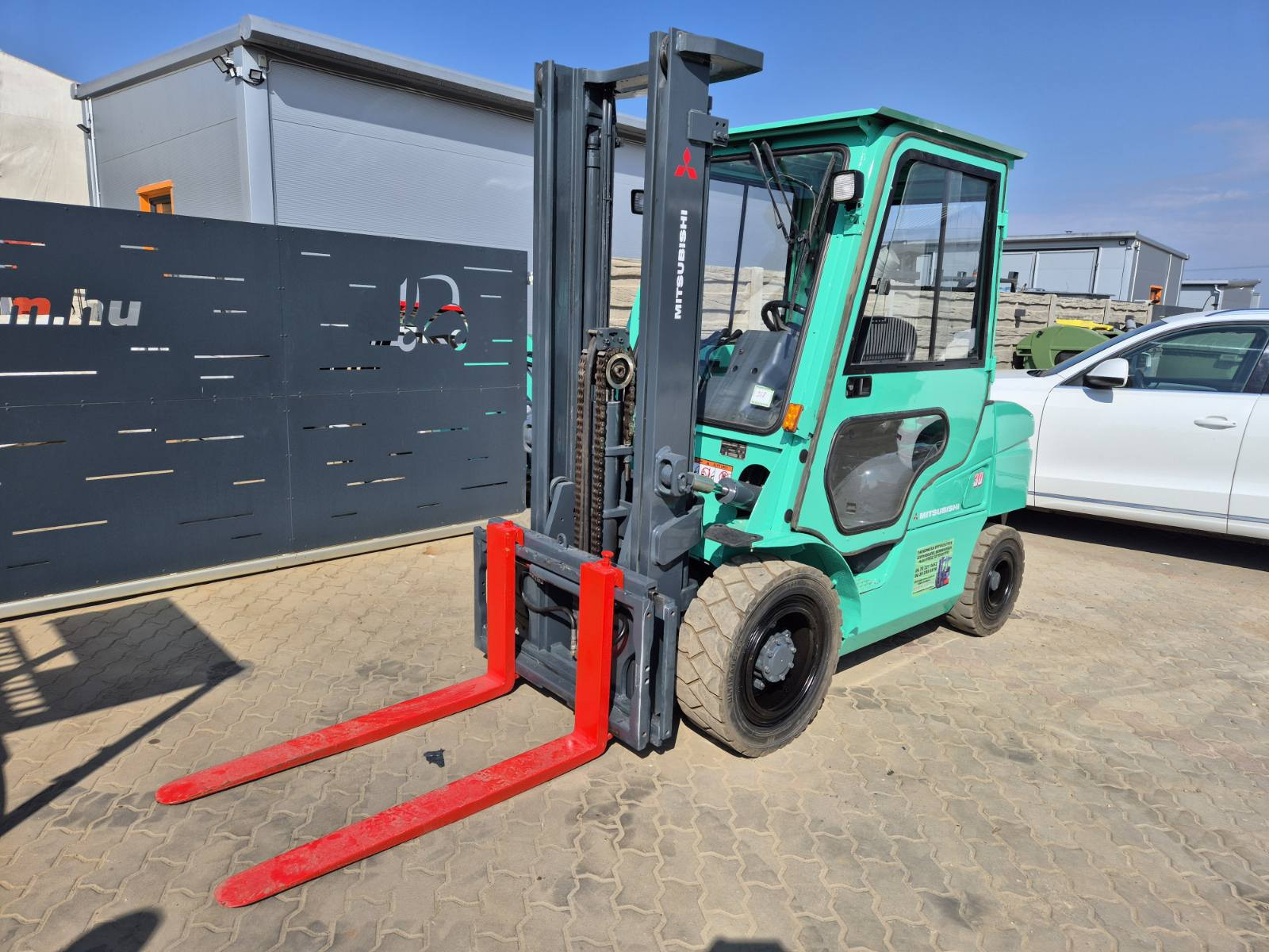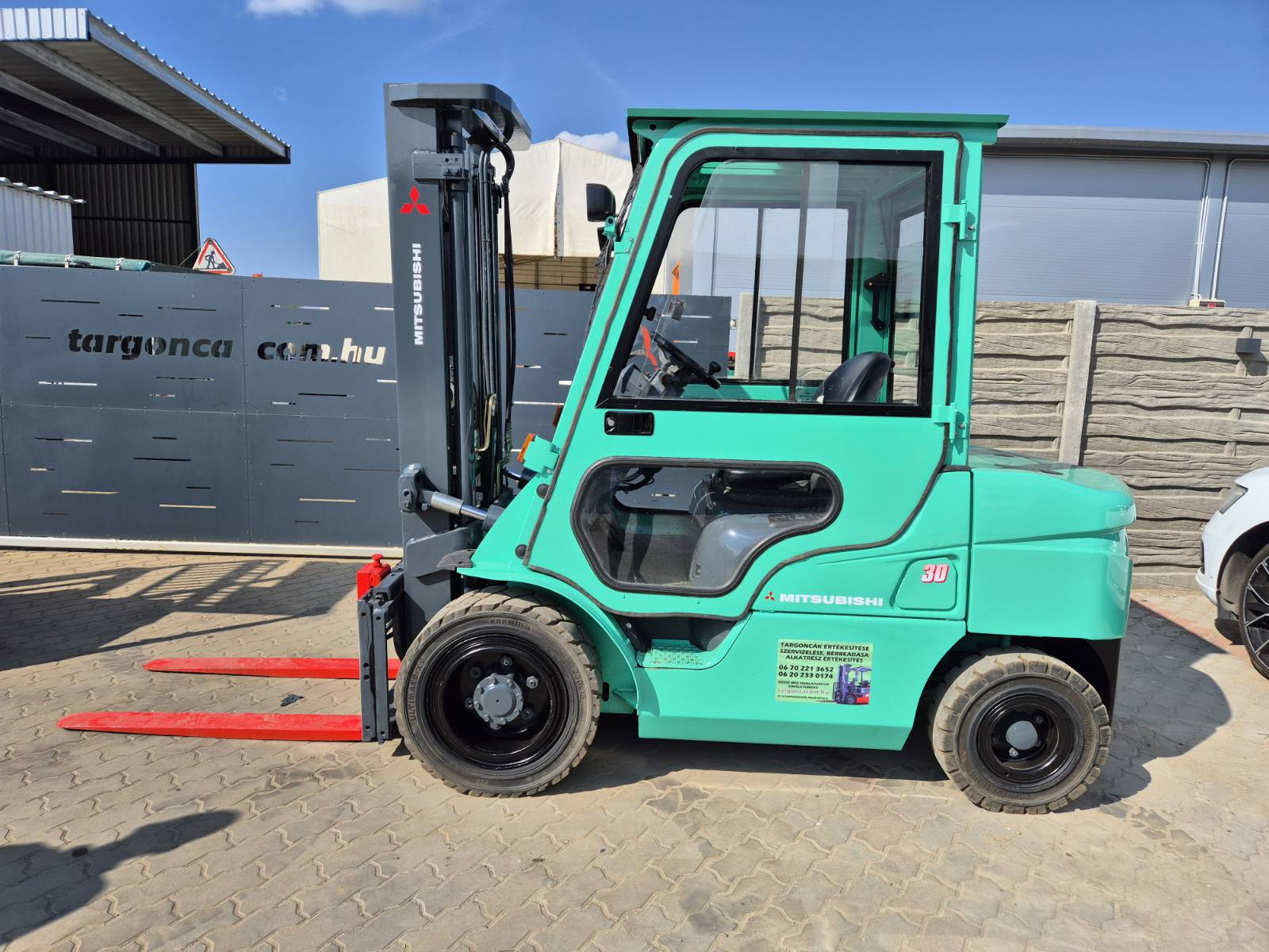 Eladó Mitsubishi FD 30N típusú diesel targonca, 3 t teherbírás, 3,3 m emelési magasság, 1,7 m szabademeléssel, Mitsubishi motorral, oldalmozgatóval, 9306 üzemórával, munkalámpával, ablaktörlővel, kitűnő állapotban. (358)