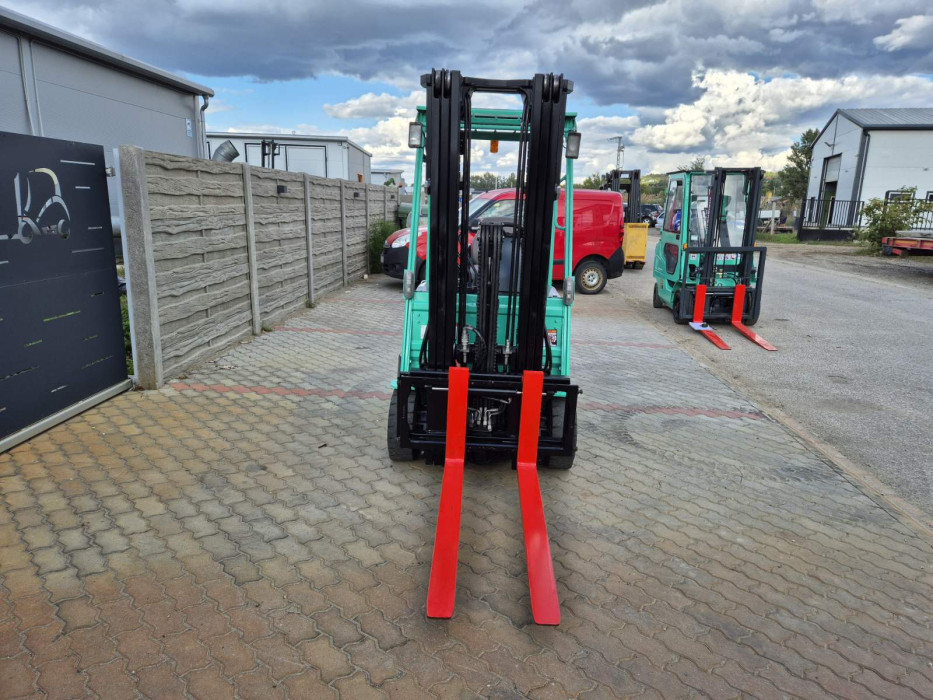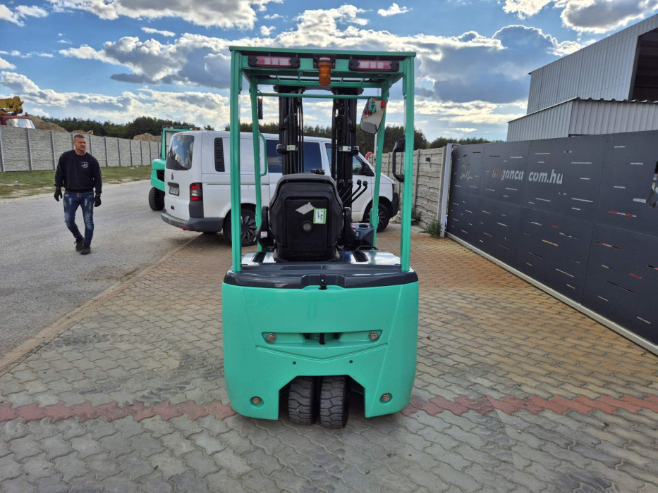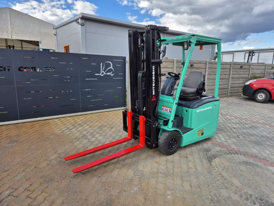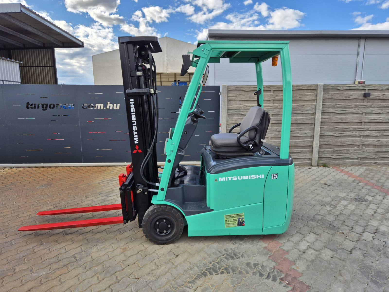 Eladó Mitsubishi FB 15PNT típusú elektromos targonca, 1,5 t teherbírás, 4,75 m emelési magasság, 1,6 m szabademeléssel, 48V/550Ah Hawker akkumulátorral, töltővel, 5459 üzemórával, oldalmozgatóval, munkalámpával, kitűnő állapotban. (58)