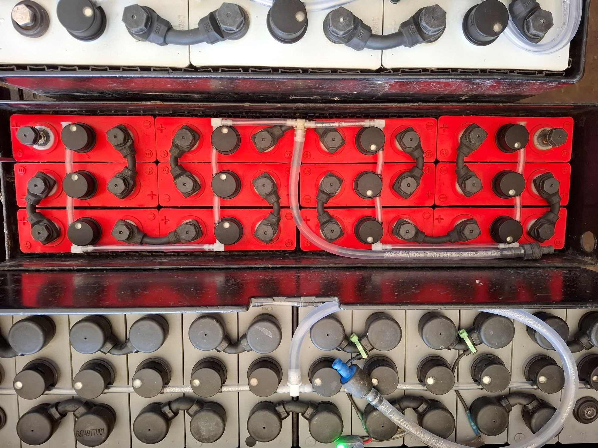 Eladó használt, bevizsgált garanciális 24V 375Ah akkumulátor automata vízfeltöltő rendszerrel.