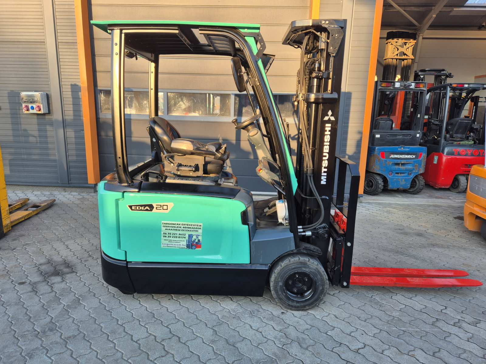 Eladó Mitsubishi FB 20ANT típusú elektromos homlokvillás targonca, 2 t teherbírás, 4,8 m emelési magasság, 1,6 m szabademeléssel, 48V/650Ah Hawker akkumulátorral, töltővel, 9297 üzemórával, oldalmozgatóval, munkalámpával, kitűnő állapotban. (T82)